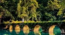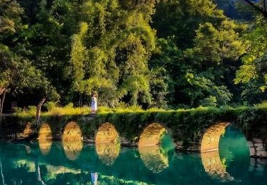 小七孔古桥——建于清道光十五年(1835年)的七孔石桥,横跨响水河,桥身藤萝垂挂,桥下碧潭如镜。晨雾弥漫时,古桥倒影与远山近水浑然一体,宛如水墨丹青。